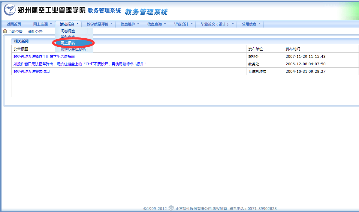 第一步:登录学生个人的教务管理系统进入首页,点击活动报名→网上报名