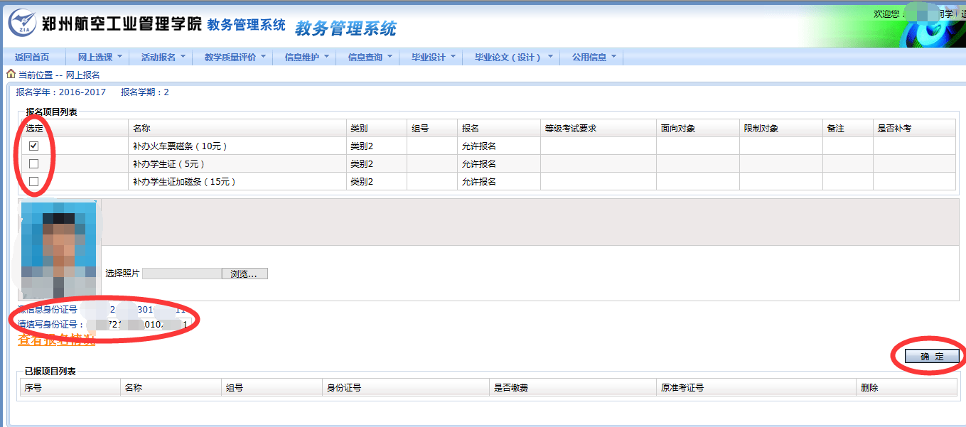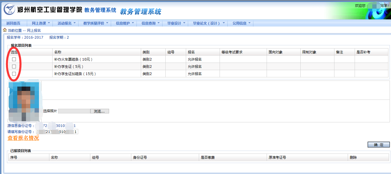 第二步:根据个人情况进行报名:仅能选填1项(分补办磁条、补办学生证、补办学生证加磁条三种情况)
